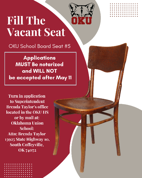 The Oklahoma Union School Board will be accepting applicants to fill vacant seat #5, which has a 5-year term. To be eligible to be a member of the Oklahoma Union Board of Education, a person must have resided in the district for at least six months preceding the first day of the filing period and have been a registered voter registered with the county election board at an address located within the geographical boundaries of the district for six months preceding the first day of the filing period. APPLICATIONS MUST BE NOTARIZED AND WILL NOT BE ACCEPTED AFTER MAY 11, 2026. Turn in application to Superintendent Brenda Taylor's office located in the OKU HS or by mail at: