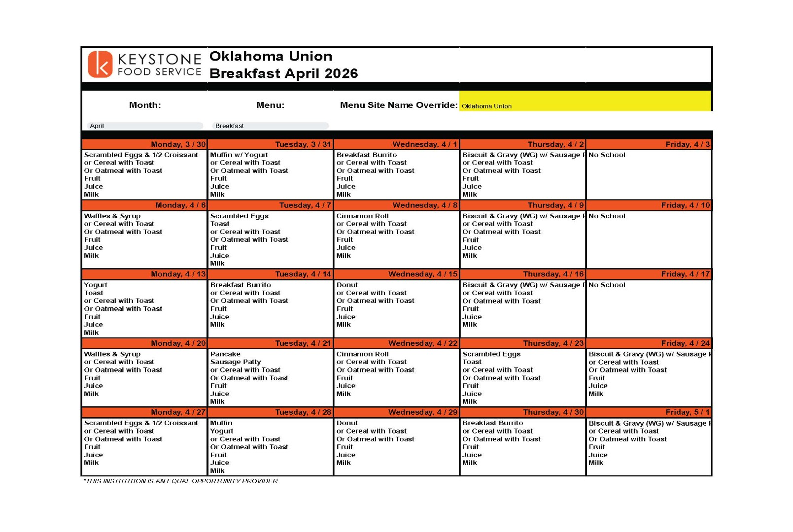 Breakfast menus for both campuses